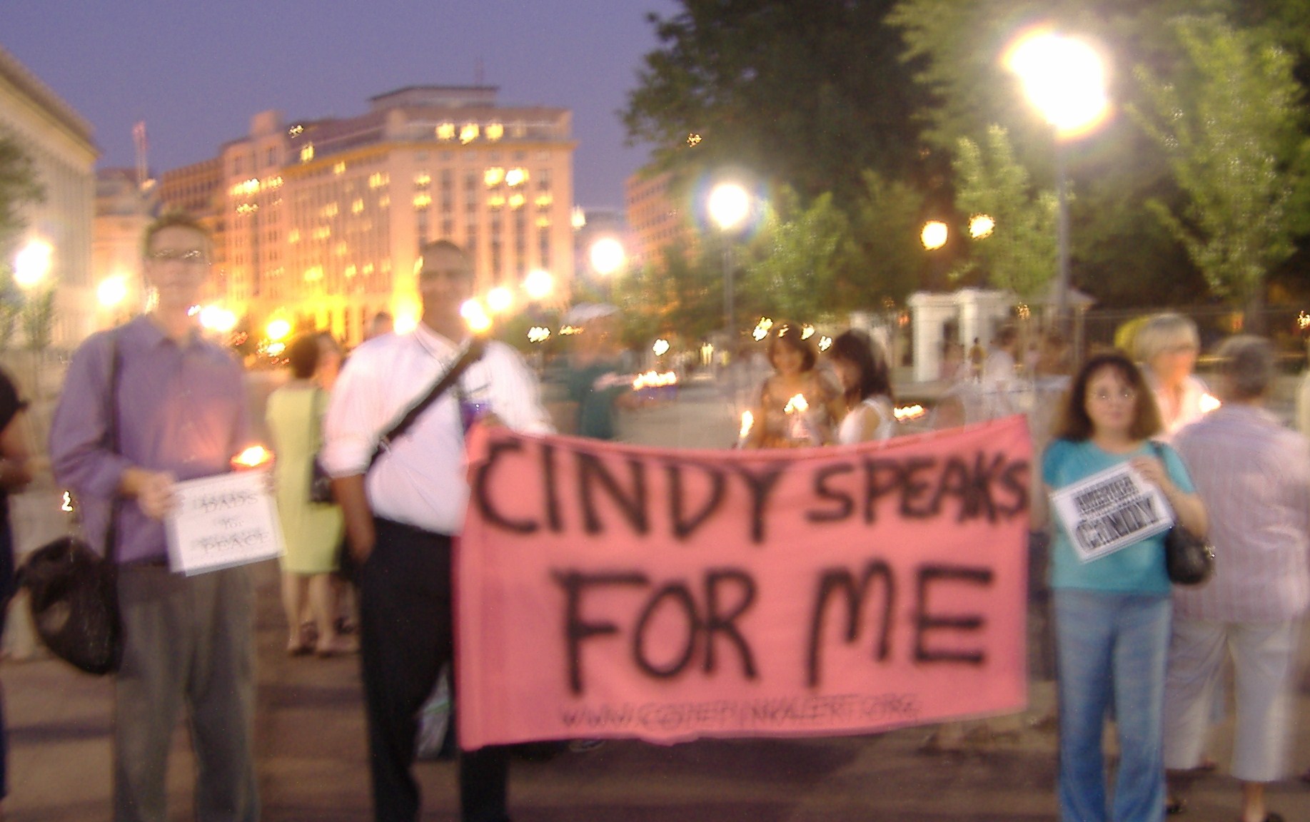 2005년 1월, 미국 친구 봉사 위원회의 전시회 "눈 크게 뜨고: 전쟁의 인명 피해"에 참여하여 아들의 전투화를 기증하고, 평화를 위한 골드 스타 가족을 창립했다.[13][14][15][16] 같은 해 8월, 부시 대통령의 텍사스주 크로퍼드 목장 앞에서 시위를 벌이며 국제적인 주목을 받았다.[17][18] 그녀는 부시 대통령에게 아들의 죽음에 대한 진실을 요구하며, 2004년 연방 소득세 납부를 거부하겠다고 선언했다.
