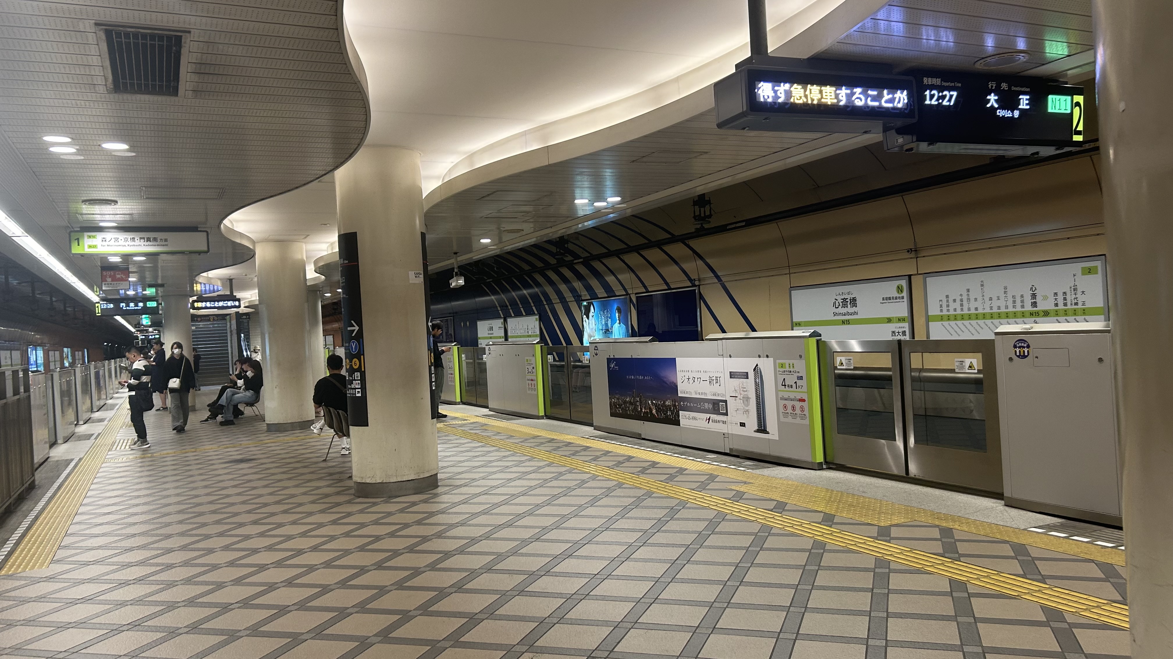 오사카 메트로 미도스지선 - 다이코쿠초역 다이코쿠초역은 오사카 메트로의 미도스지선과 요쓰바시선이 환승되는 지하역으로, 두 노선 승강장이 같은 층에 있어 환승이 편리하며 스크린도어가 설치되었고, 2023년 기준 하루 승하차 인원은 34,577명이며 주변에 다양한 시설과 인접 역들이 위치해 있다.