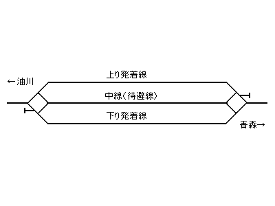 아오모리역에서 약 4.4km 지점에 위치한다. 상하 본선 사이에 중선(대피선)이 있는 3선 구조의 신호장으로, 구내 배선 약도상으로는 '''단선 교환 대피형''' 신호장으로 분류된다. 상하 각 방향 출발 측에 안전 측선이 설치되어 있어 양방향 열차의 동시 진입이 가능하다. 쓰가루선과 해협선을 경유하여 홋카이도 방면으로 운행하는 장대 화물 열차의 교행 및 대피를 위해 유효장이 매우 길게 확보되어 있다.