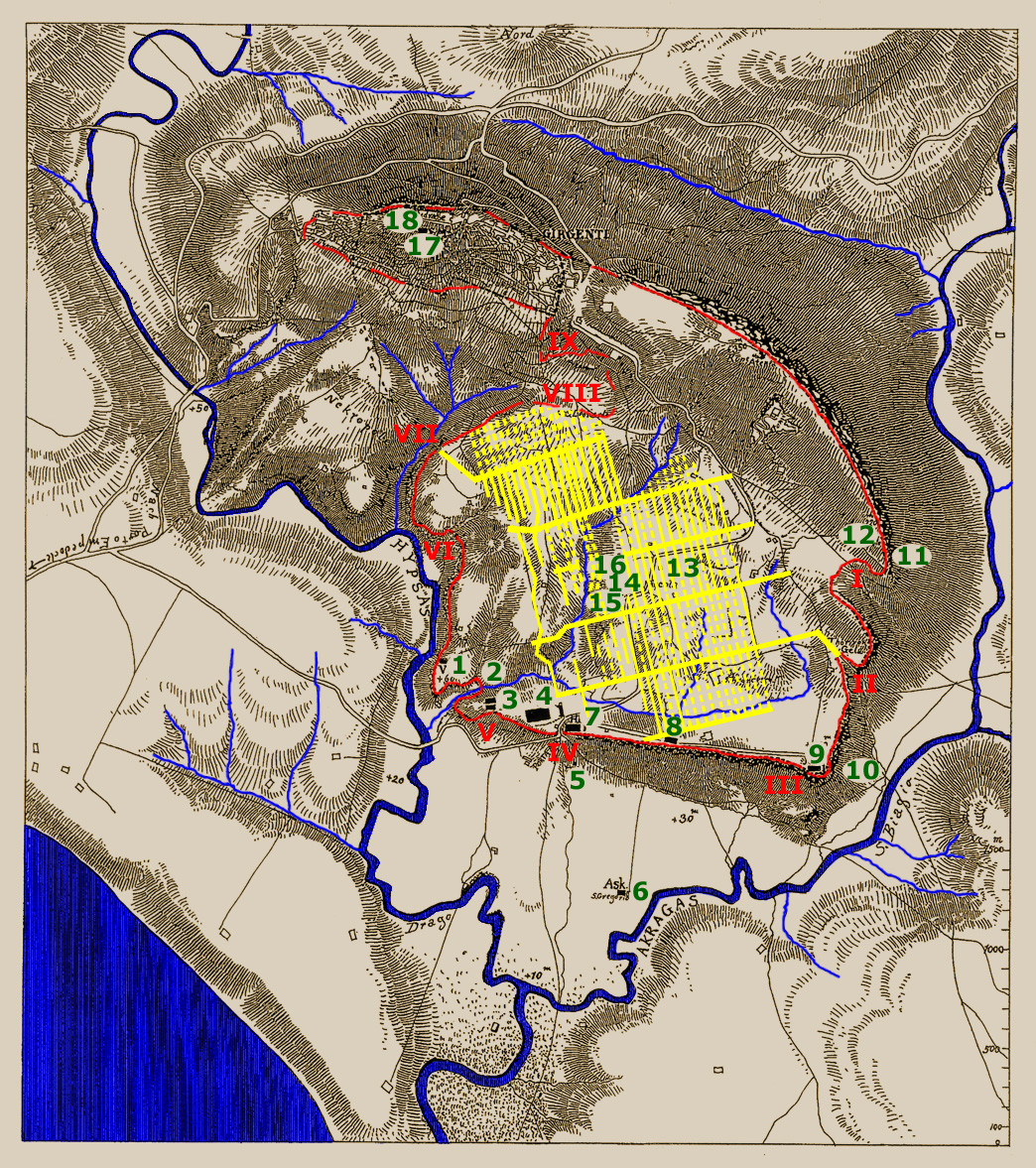 아그리젠토 서쪽에는 문 6과 7의 유적이 있는데, 전자는 헤라클레스 길에 있었을 것이고, 후자는 두 개의 탑과 두 개의 외부 보루(벽 두께 15m)를 가지고 있다. 북쪽에는 불법 건물로 둘러싸인 문 8과 9의 유적이 있다.