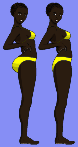 콘트라포스토 자세(체중의 대부분을 한쪽 다리로 지탱하며, 그 다리는 곧거나 아주 약간 구부리고, 다른 한쪽 다리는 약간 구부리는)로 서는 것은 더 평범하고 똑바로 선 자세보다 매력적으로 보이는 것으로 나타났다. 이는 남녀 모두에게 해당되는 것으로 밝혀졌다.[106][107] 이 자세는 관찰 가능한 허리-엉덩이 비율을 낮추고, 엉덩이를 넓어 보이게 하며, 허리를 가늘어 보이게 할 수 있다. 특히 여성의 경우, 몸의 한쪽 측면의 굴곡을 강조하여 더 매력적으로 보이게 할 수 있다. 이러한 자세는 신체 미의 이상을 강조하기 위해 역사적인 조각에서 사용되어 왔다.[441][442] 또한 여성의 콘트라포스토 자세는, 서 있는 자세보다 지각과 매력 평가와 관련된 뇌 부위의 신경 활동을 유발하는 것으로 나타났다.[108][443]
