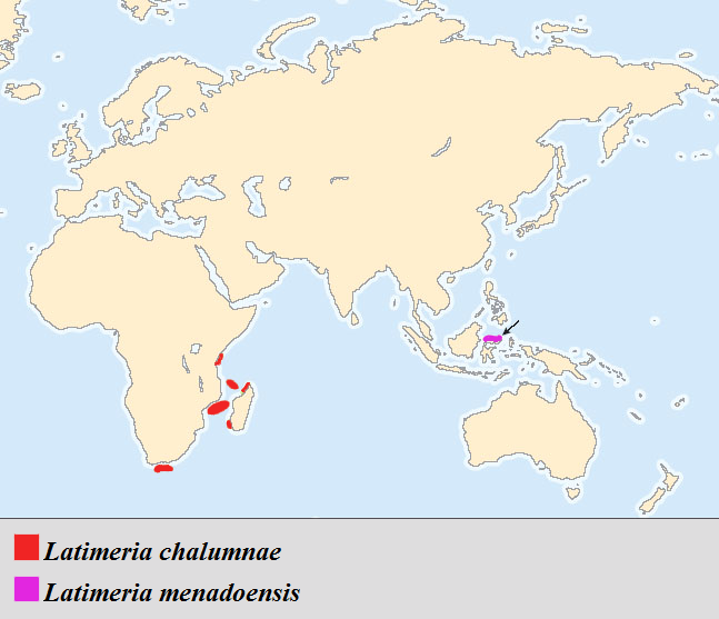 인도네시아 실러캔스(''Latimeria menadoensis'')의 지리적 범위는 셀레베스 해의 인도네시아 술라웨시섬, 마나도 투아섬 연안에 있는 것으로 추정된다.[61] 실러캔스를 이러한 영역으로 제한하는 주요 구성 요소는 음식 및 온도뿐만 아니라 표류 먹이에 적합한 동굴 및 틈새와 같은 생태학적 요구 사항이다.[62] 잠수정을 통해 연구팀은 술라웨시 해와 파푸아의 비악 해역에서 목격한 것을 기록했다.[63][64]