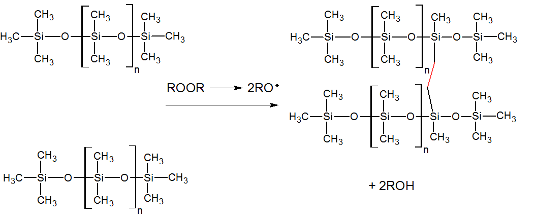 - 과산화물 경화 시스템: 유기 과산화물을 사용하여 경화시킨다. 디큐밀 과산화물(아세토페논, 2-페닐-2-프로판올), 2,4-디클로로벤조일 과산화물(2,4-디클로로벤조산, 1,3-디클로로벤젠) 등이 사용된다. 부산물이 발생할 수 있어 식품 접촉 및 의료용으로는 후경화 처리가 필요하다.
