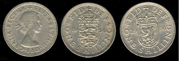 1971년 2월 15일 십진법 전환으로 폐지되었지만, 한동안은 종전과 동등한 가치의 5 신 페니 (1파운드 = 100 신 페니)로 사용되었다.[1] 조지 6세와 엘리자베스 2세의 실링화는 잉글랜드 사양과 스코틀랜드 사양의 것이 발행되었다.[1] 1920년까지는 스털링 실버, 1921년부터 1946년까지는 .500의 은화, 1947년부터 1970년까지는 백동화로 제조되었다.[1]3. 2. 2실링 및 기타 통화