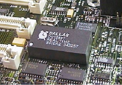 RTC는 1984년 IBM PC/AT에 의해 PC 호환 기기에 도입되었으며, 모토롤라(Motorola)(Motorola) MC146818 RTC를 사용했다.[14][15] 나중에 달라스 반도체(Dallas Semiconductor)(Dallas Semiconductor)는 호환되는 RTC를 만들었는데, 이는 종종 오래된 개인용 컴퓨터에서 사용되었으며, 독특한 검은색 배터리 캡과 실크스크린 인쇄된 로고 때문에 마더보드에서 쉽게 찾을 수 있다.