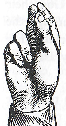 손가락 모양에 대해서 천주교회는 특별히 정해진 바는 없으나, 오른손의 모든 손가락을 펴서 사용하는 경우가 많다. 과거에는 삼위일체를 상징하는 의미로 세 손가락(엄지, 검지, 중지)을 모으고 예수 그리스도의 신성과 인성을 나타내는 나머지 두 손가락(약지, 소지)을 손바닥에 붙이는 방식을 사용하기도 했다.[10][59]