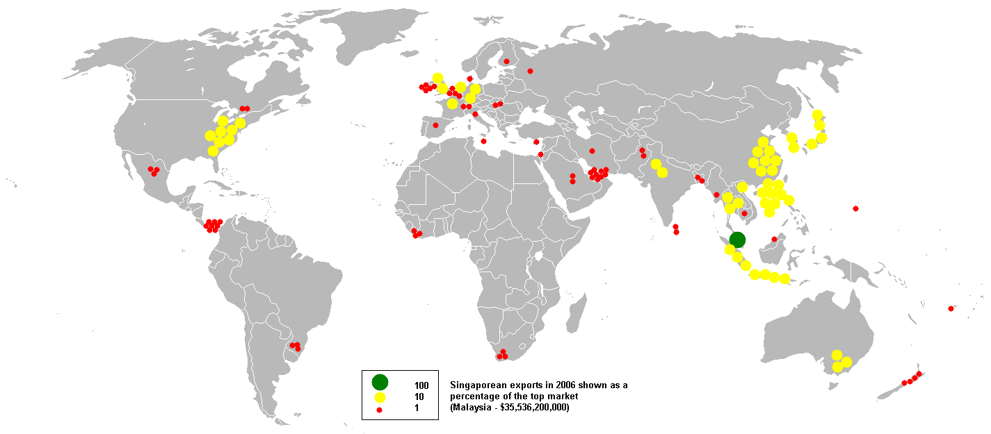 싱가포르의 주요 수출 품목은 전자 제품, 화학 제품 및 서비스이며, 자산 관리의 지역 허브이기도 하다.[38][39][40] 물은 싱가포르에서 부족하여 상당 부분을 말레이시아에서 수입하므로 귀중한 자원으로 여겨진다.