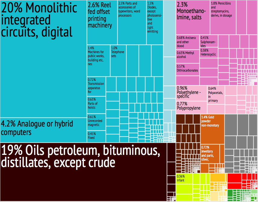 주요 산업 | 전자 제품 금융 서비스 정보 통신 기술 토목 공학 석유 시추 및 탐사 석유 정제 화학 제품 화장품 생물 의학 과학 기기 의료 관광 통신 장비 고무 식품 및 음료 제품 해양 공학 및 조선 보안 서비스 생명 과학 재수출 폐기물 관리 및 재활용 예술 및 엔터테인먼트 패션 디자인 소규모 농업 및 양식업 |