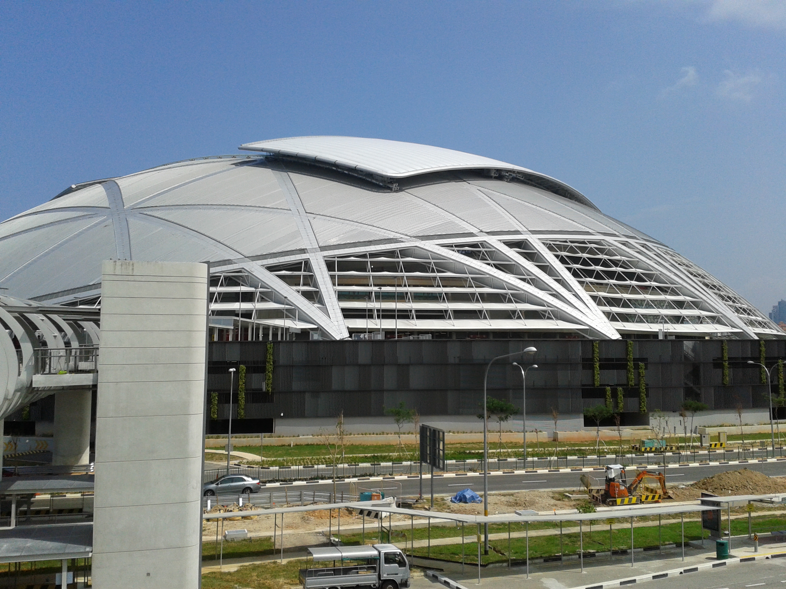 이 경기장은 75000m2 규모에 83m 높이의 강철 돔으로 된 개폐식 지붕을 갖추고 있으며, 이는 세계에서 가장 큰 돔 구조라고 한다.[11] 싱가포르의 열대 기후로 인해 경기장의 지붕은 내부를 단열하기 위해 햇빛을 반사하도록 설계되었으며, 자연 기류를 사용하여 유사한 규모의 경기장보다 적은 에너지 사용량으로 관람석을 냉각한다.[11]