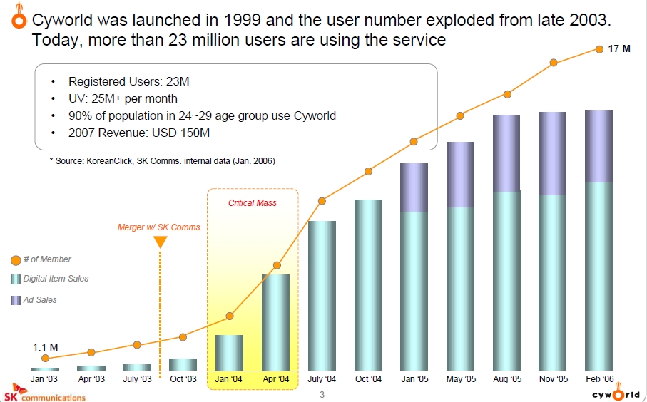 SK커뮤니케이션즈와의 합병은 즉각적인 시장 성공으로 이어졌다. 2003년 말, 싸이월드는 "싸이폐인"(싸이월드 중독자)과 "싸질"(싸이월드 관련 활동)이라는 용어를 만들어낼 정도로 큰 인기를 얻었다.[22] 월간 방문자 수는 2003년 초 200만 명에서 2003년 11월 700만 명으로 세 배 이상 증가했다.[22]