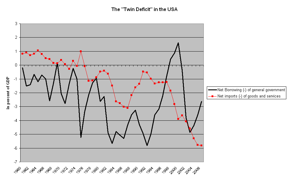 미국에서는 예산 적자가 외국인과 국내에서 각각 절반씩 자금을 조달한다. 따라서 이론에 따르면 4조달러의 추가 적자가 발생하면 무역 적자는 약 2000억달러 증가하게 된다.