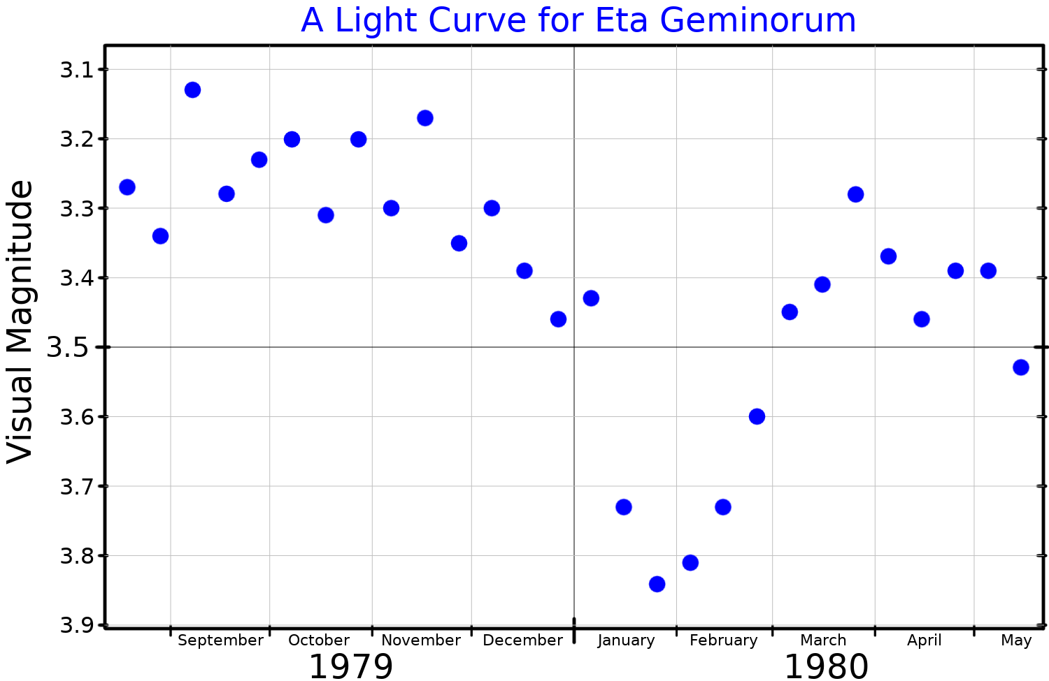 1865년 율리우스 슈미트는 쌍둥이자리 에타가 변광성임을 처음 보고했다. 슈미트와 다른 관측자들은 밝기 변화를, 일정한 밝기의 긴 극대와 크기 및 모양이 크게 변하는 극소, 그리고 약 231일 주기를 갖는 것으로 묘사했다. 이 별은 반규칙 변광성과 식 변광성으로 분류되었다. 식의 주기는 약 8년으로, 보이지 않는 동반성의 궤도에 해당한다. 식 현상은 처음에는 의문이 제기되었지만, 특별한 프로젝트를 통해 1980년 2월, 1988년 4월, 2012년 10월의 식 현상을 잘 관측할 수 있었다. 식 현상의 깊이는 약 0.5등급이며 지속 시간은 수 주이다.