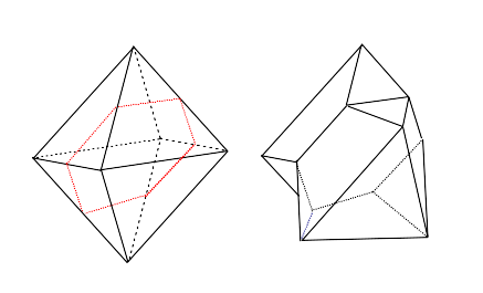 휘석이나 석고의 단결정은 평행사변형 모양을 하고 있으며, 쌍정은 이 결정의 중앙에서 세로 방향으로 거울을 세운 듯한, 시위 모양의 형태를 하고 있다.[1]