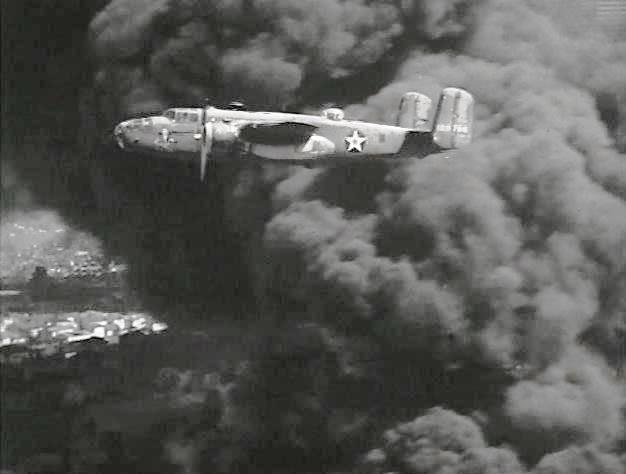 "파손된 오리"가 ''써티 세컨즈 오버 도쿄''(Thirty Seconds over Tokyo)에서 불타는 목표 위를 날고 있다.