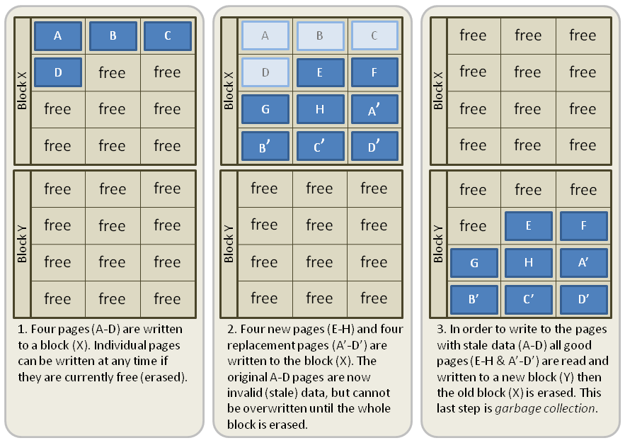 SSD는 플래시 메모리 셀에 데이터를 저장하며, 쓰기 작업은 페이지 단위로, 지우기 작업은 블록 단위로 수행된다.[52] 플래시 메모리의 특성상 하드 디스크 드라이브와 달리 데이터를 직접 덮어쓸 수 없다. 따라서 기존 데이터를 업데이트하려면 가비지 컬렉션 과정이 필요하다.
