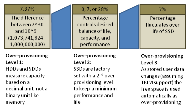 # 드라이브의 알려진 사용 가능한 사용자 공간은 사용하지 않는 부분을 보고하는 대신, 또는 현재 또는 미래 용량을 희생하면서 내구성과 성능을 얻는다. 이 사용 가능한 공간은 TRIM 명령을 사용하여 운영 체제에서 식별할 수 있다. 또는 일부 SSD는 최종 사용자가 추가 오버 프로비저닝을 선택할 수 있는 유틸리티를 제공한다. 또한, SSD가 사용 가능한 공간의 100% 미만인 전체 파티션 레이아웃으로 설정된 경우, 해당 파티션되지 않은 공간은 SSD에서 자동으로 오버 프로비저닝으로 사용된다.[27]