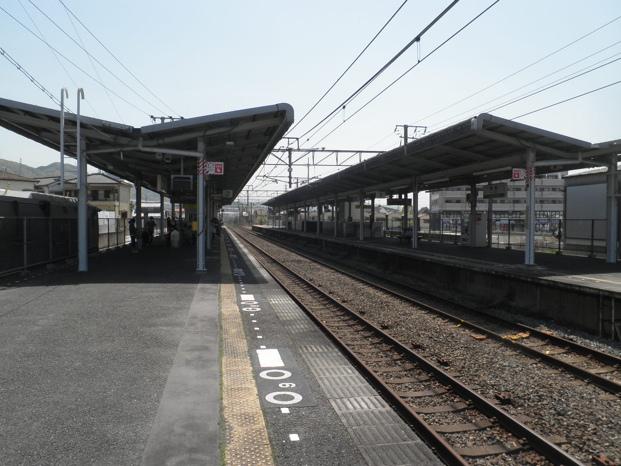 상대식 승강장 2면 2선의 지상역이다. 승강장 양쪽에 대피선 설치를 위한 공간이 있으며, 2면 4선으로 확장할 수 있게 되어 있지만, 현재는 보선 차량의 유치 공간으로 사용되고 있으며, 또한 절대 신호기를 갖추지 않아 정류소 취급이다.[6] 경사면에 승강장이 있기 때문에, 역사가 있는 층에서 승강장으로 가려면 계단을 올라야 한다.[6] 2011년에 역과 상행 승강장을 잇는 엘리베이터가 상행 대피선 설치 공간에 설치되었기 때문에, 상행 대피선을 설치하는 것은 불가능하게 되었다.