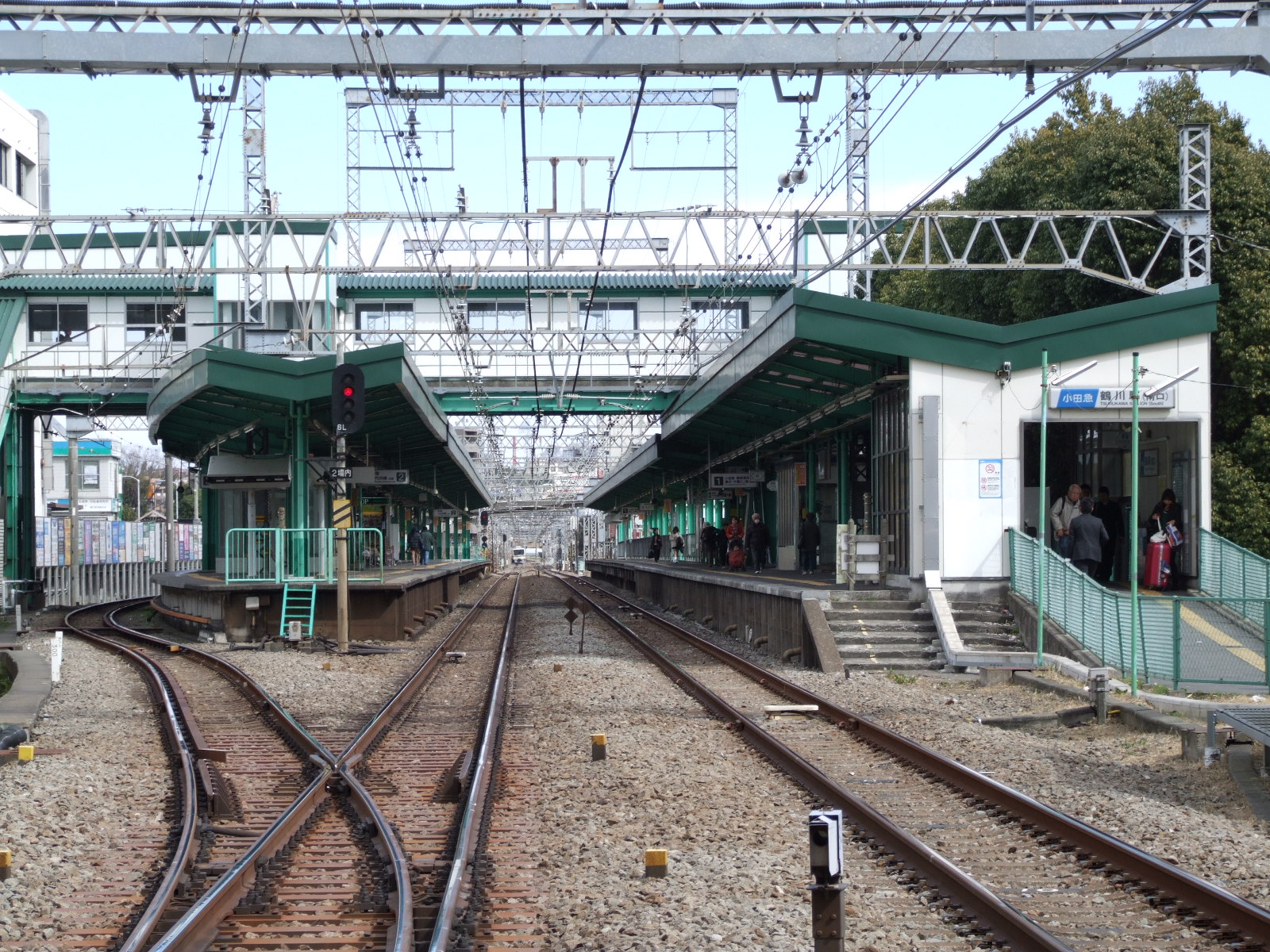 쓰루카와역은 혼합식 승강장 2면 3선의 지상역이다. 상행선에만 대피 설비를 갖추고 있으며, 아침 러시아워에는 이 역에서 급행을 대피하는 완행이나 준급행 운행이 많다.요요기우에하라 역에서는