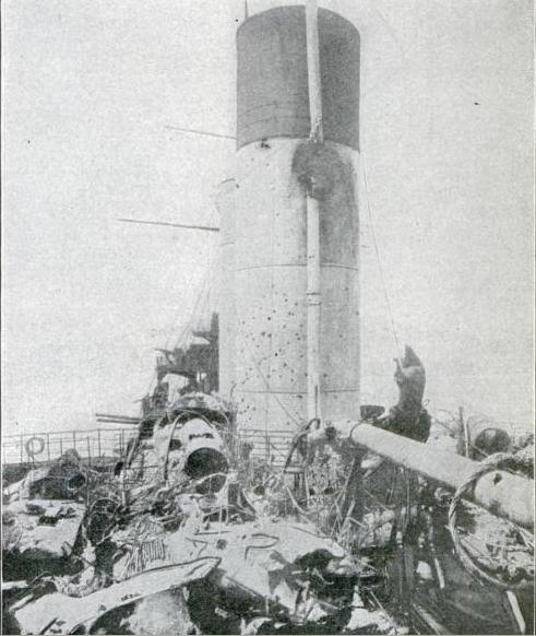 - 발트 함대는 기함 미카사를 집중 포격했지만, 도고 헤이하치로는 최신예이자 가장 장갑이 두꺼운 미카사에 피탄을 집중시켜 다른 함선에 피해가 미치지 않도록 의도했다.[63] 도고 헤이하치로는 미카사가 대파하고 자신이 전사하더라도 정자 형태를 완성하는 것을 최우선으로 했다.