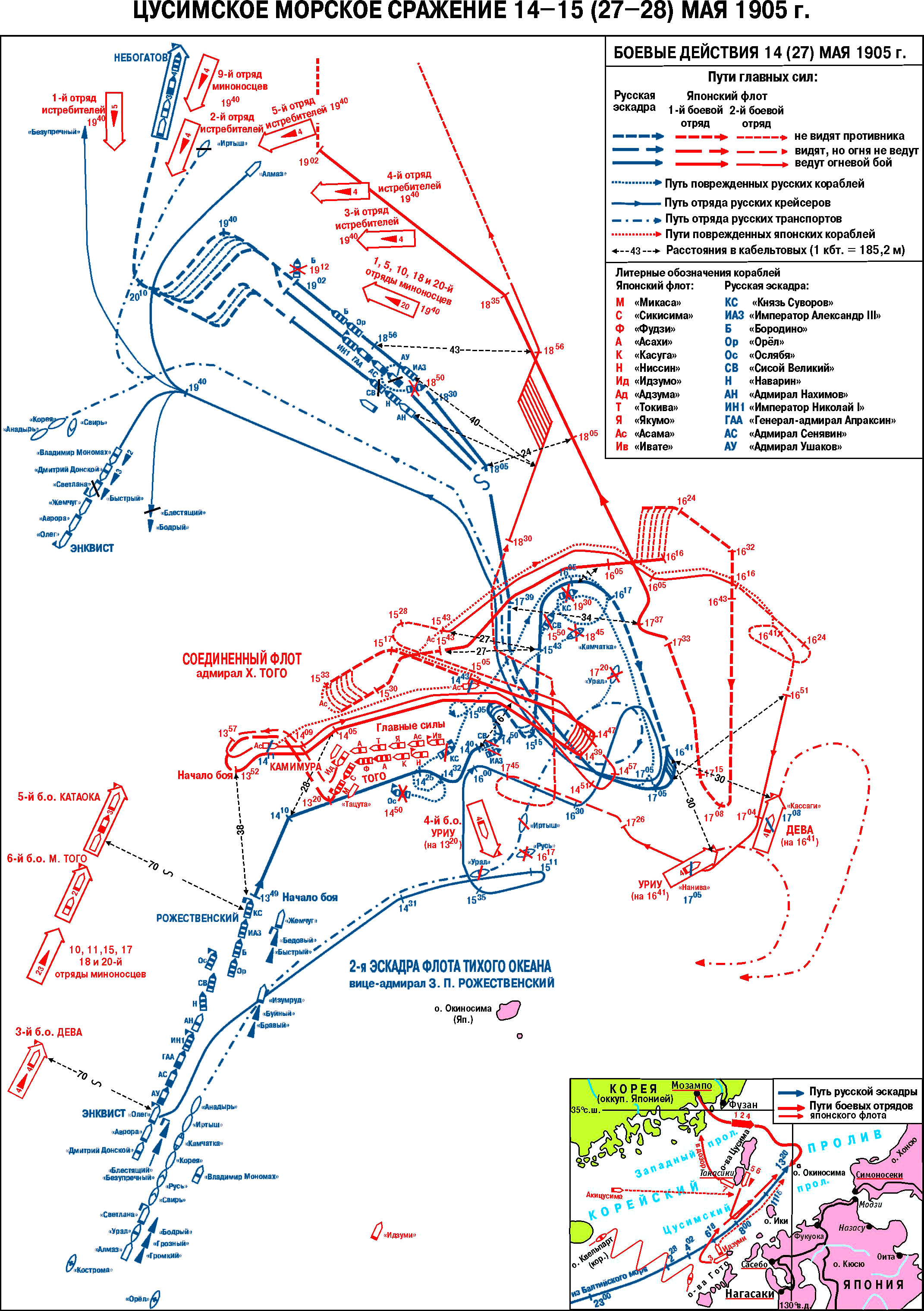 러일전쟁 중 러시아는 일본을 압박하기 위해 함대를 동원했지만, 각 지역에 흩어진 함대를 모으기는 쉽지 않았다. 흑해 함대는 오스만 제국 때문에 출동이 불가능했고, 태평양 함대[87]만으로는 일본 해군에 대항하기 어려웠다. 이에 러시아 해군 사령부는 지노비 로제스트벤스키 제독이 이끄는 발트 함대[88]와 니콜라이 네보가토프 제독이 이끄는 제3태평양함대를 추가로 파견했다.