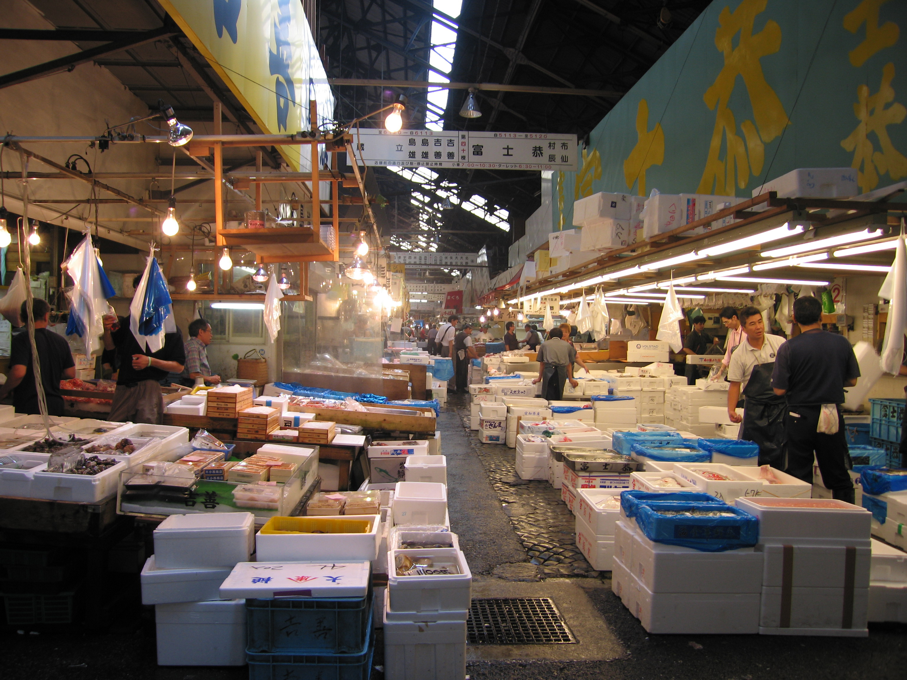 일본의 에도 시대부터 도쿄 지역의 식품 거래 중심지 역할을 해왔다. 원래 시장은 니혼바시 지역에 있었으며, 魚河岸|우오가시일본어(문자 그대로 '생선 부두')라는 이름으로 불렸다.[15] 이 지역은 에도 시대 초기 도쿠가와 이에야스가 에도성을 건설하면서 가장 먼저 정착된 곳 중 하나였다. 1590년, 도쿠가와 이에야스는 오사카의 쓰쿠다에서 어부들을 데려와 에도성에 생선을 공급하도록 했고,[14] 성에서 소비되지 않은 생선들이 니혼바시 다리 근처의 우오가시에서 판매되기 시작하면서 시장이 형성되었다.[15]