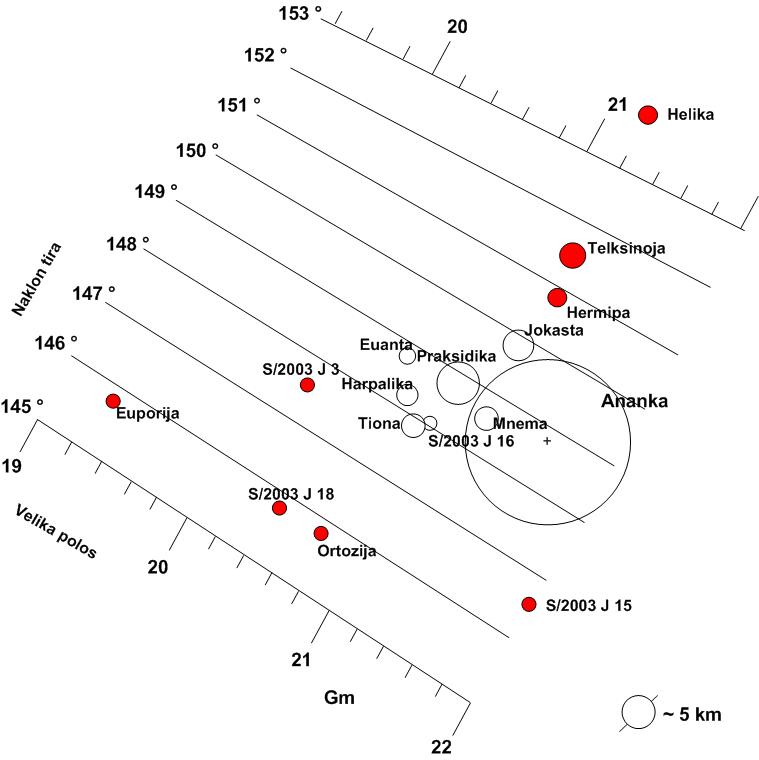 아난케 군에 속한 위성들의 크기를 나타내는 다이어그램. 세로 방향은 궤도 경사를 나타내며, 가로 방향은 목성으로부터의 거리를 나타낸다. "Ananka"가 아난케를 나타낸다.