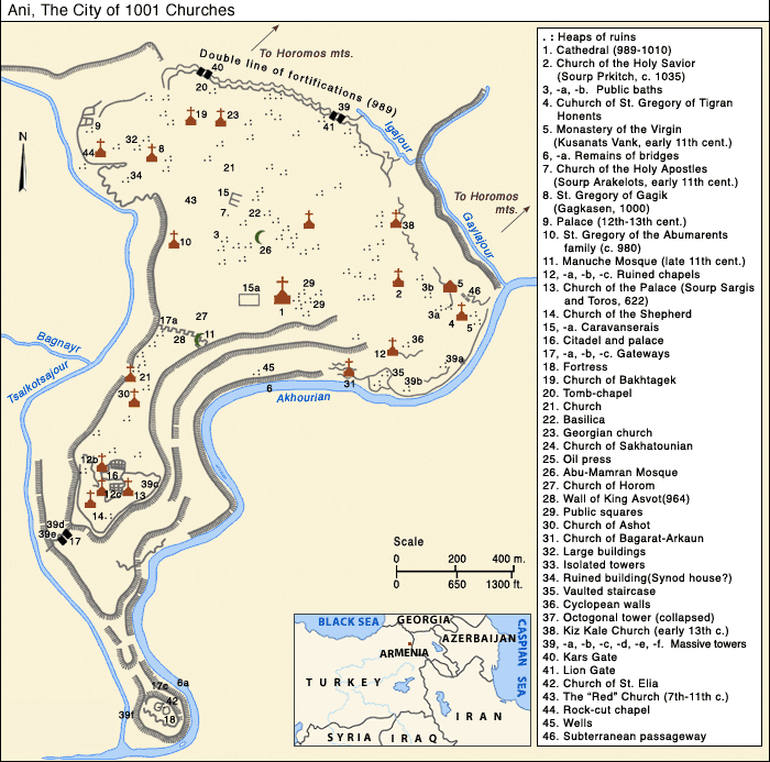 아니(Ani)는 튀르키예 카르스 주에 위치한 고대 도시로, 아르메니아와 튀르키예 국경 근처에 자리 잡고 있다. 아흐우리안 강과 보스탄라르 계곡, 차흐코차조르 계곡으로 둘러싸인 천연 요새 지형에 위치하며, 5세기부터 아르메니아의 역사적 기록에 등장한다. 바그라투니 왕조 시대에 수도로서 전성기를 누렸으며, "40개의 문이 있는 도시", "천과 하나의 교회가 있는 도시"로 불릴 정도로 번성했다. 다양한 문화와 건축 양식이 공존하며, 특히 아르메니아 사도 교회의 건축 유산이 풍부하다. 1064년 셀주크 제국의 침략 이후 쇠퇴하기 시작하여, 몽골 제국, 조지아 왕국 등 여러 세력의 지배를 거치며 파괴되었다. 19세기부터 유럽 여행가들에 의해 외부 세계에 알려졌으며, 2016년 유네스코 세계 문화 유산으로 등재되었다. 아니 대성당, 티그란 호넨츠 성 그레고리 교회, 구세주 교회 등 다양한 건축물이 남아 있으며, 현재는 고고학적 보존 유적지로 관리되고 있다.
