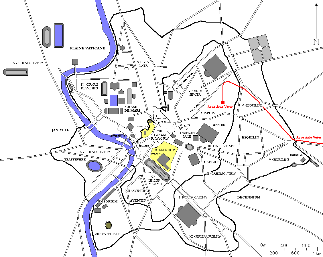 수원에서 계곡을 따라 티볼리까지 내려간 후, 알반 언덕을 향해 아니오를 떠나 팔레스트리나 아래 갈리카노 근처까지 갔다. 일곱 번째 이정표 부근에서 비아 라티나 아래를 지나 네 번째 이정표에서 북서쪽으로 방향을 틀어 로마로 들어갔다.