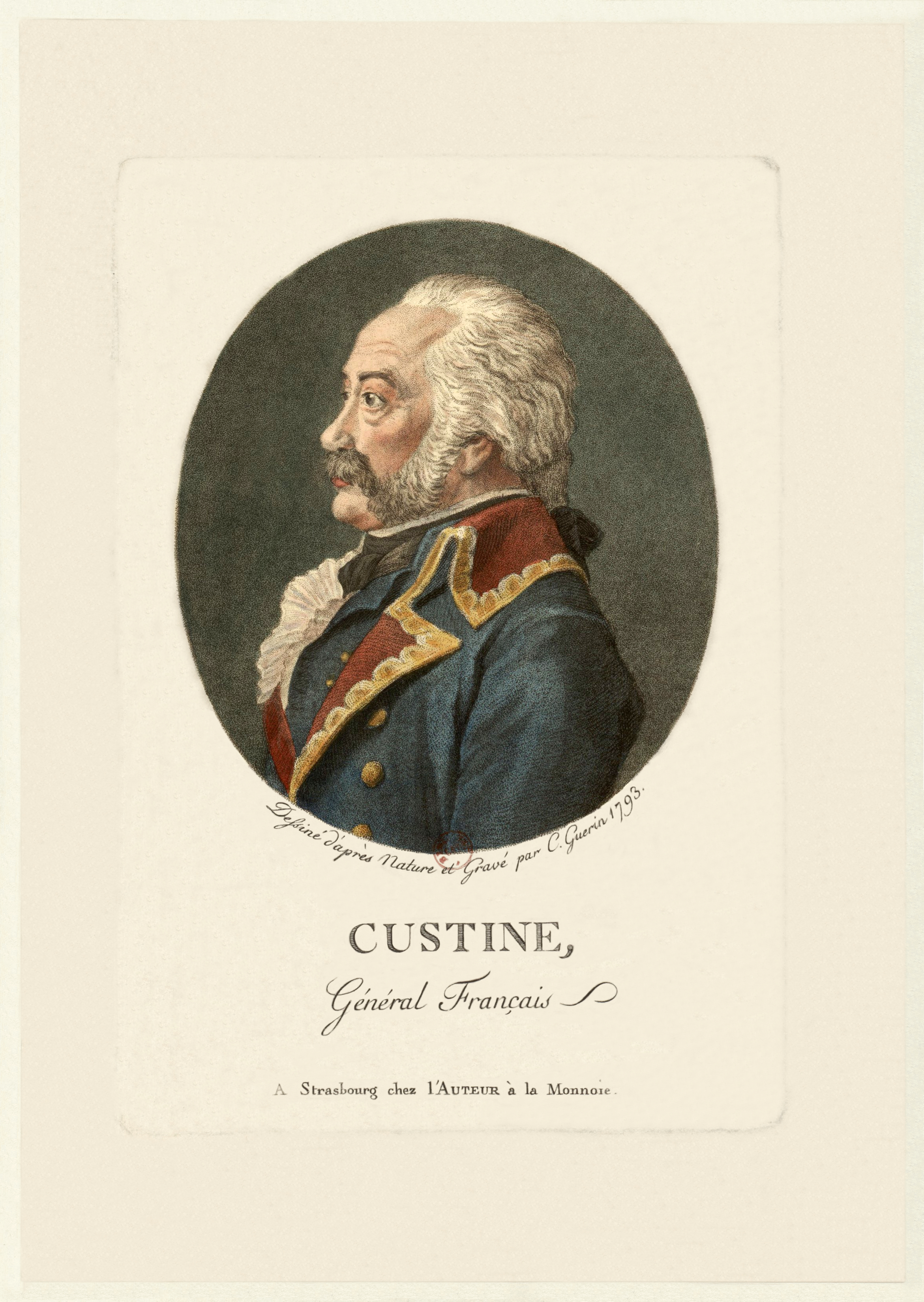 아당 필리프 드 퀴스틴 백작은 7년 전쟁과 미국 독립 전쟁에 참전한 프랑스 장군으로, 프랑스 혁명 시기에는 메스 관할구의 삼부회 의원과 군 지휘관으로 활동했다. 그는 혁명군을 이끌고 슈파이어, 보름스, 마인츠, 프랑크푸르트를 점령했으나, 프로이센군의 반격으로 후퇴한 후 반역죄로 기소되어 1793년 단두대에서 처형되었다. 그의 아들 또한 함께 처형되었으며, 퀴스틴은 니더빌러 파이앙스 공장을 소유하며 도자기 사업을 운영하기도 했다.
