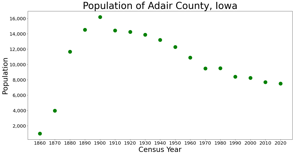 2020년 인구 조사에 따르면 아데어군의 인구는 7,496명이며, 인구 밀도는 1제곱킬로미터 당 약 13명이다. 인구의 96.88%가 단일 인종으로 보고되었다. 92.89%는 비히스패닉 백인, 0.61%는 흑인, 2.48%는 히스패닉, 0.25%는 아메리카 원주민, 0.31%는 아시아인, 0.03%는 하와이 원주민 또는 태평양 섬 주민이었으며, 3.43%는 기타 인종이거나 둘 이상의 인종이었다. 주택 유닛은 3,585개였으며, 그중 3,217개가 점유되었다.[1]4. 3. 2010년 인구 조사