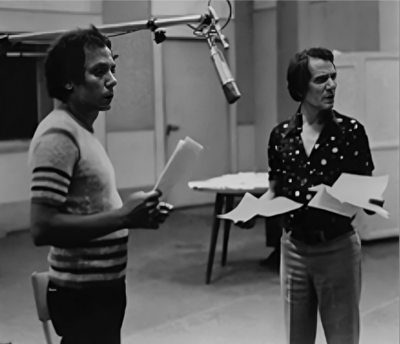 아델 에맘(왼쪽)이 1973년 압델 할림 하페즈와 함께 ''제발, 나를 빨리 이해하지 마세요''()를 녹음하는 모습