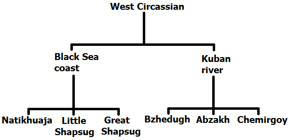 현재 방언 | 하쿠치, 예게루콰이, 체미르고이 (표준 방언), 샤프수그, 브제두그, 맘헤그, 하투콰이, 압자흐 |