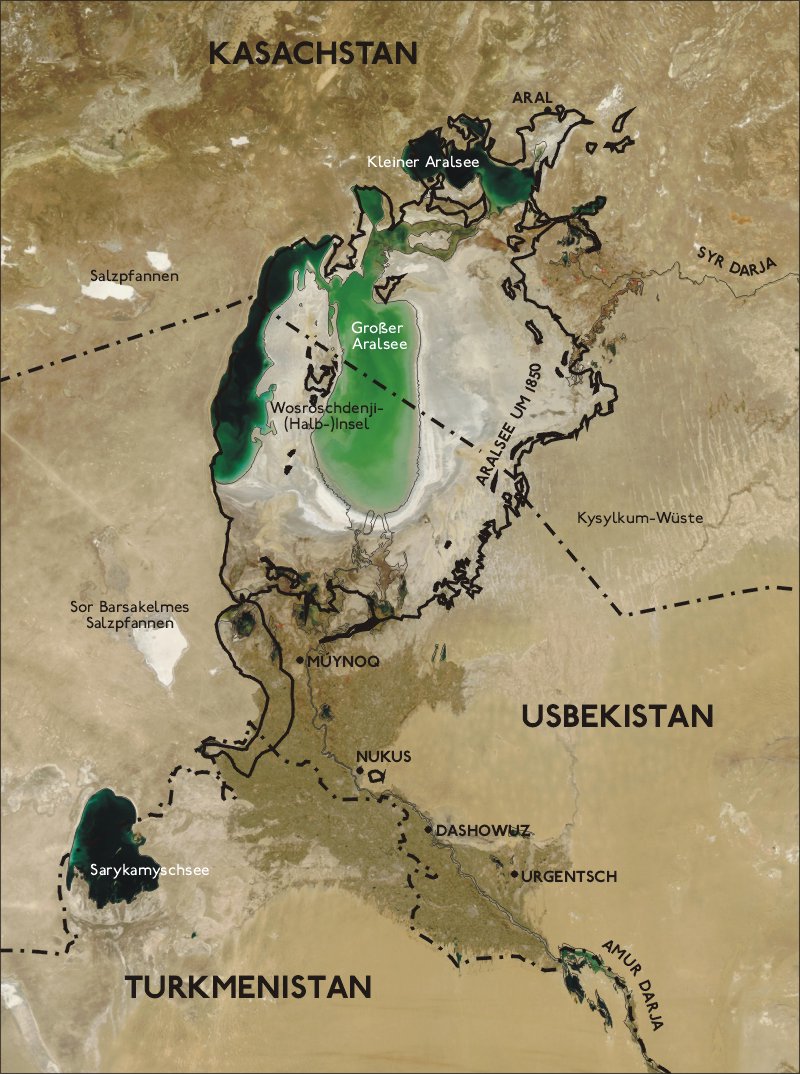 아랄해라는 이름은 "섬이 많다"라는 뜻의 튀르크어에서 유래했다.[93] 중앙아시아 서부에 있는 내륙호로, 서쪽에는 카스피해가 있으며 두 바다 사이에는 투란 저지대와 우스튜르트 고원이 있다. 아랄해의 남동쪽에는 키질쿰 사막이 있으며, 남쪽은 카라쿰 사막, 북쪽은 카자흐 초원에 둘러싸여 있다.