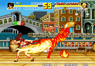 이탈리아에서 시라누이 마이와 앤디 보가드의 대결을 보여주는 게임플레이 스크린샷.