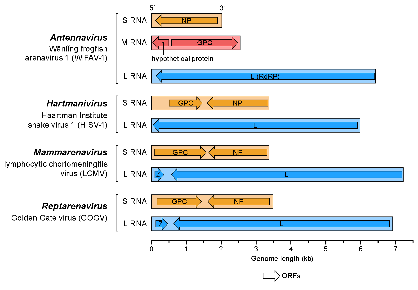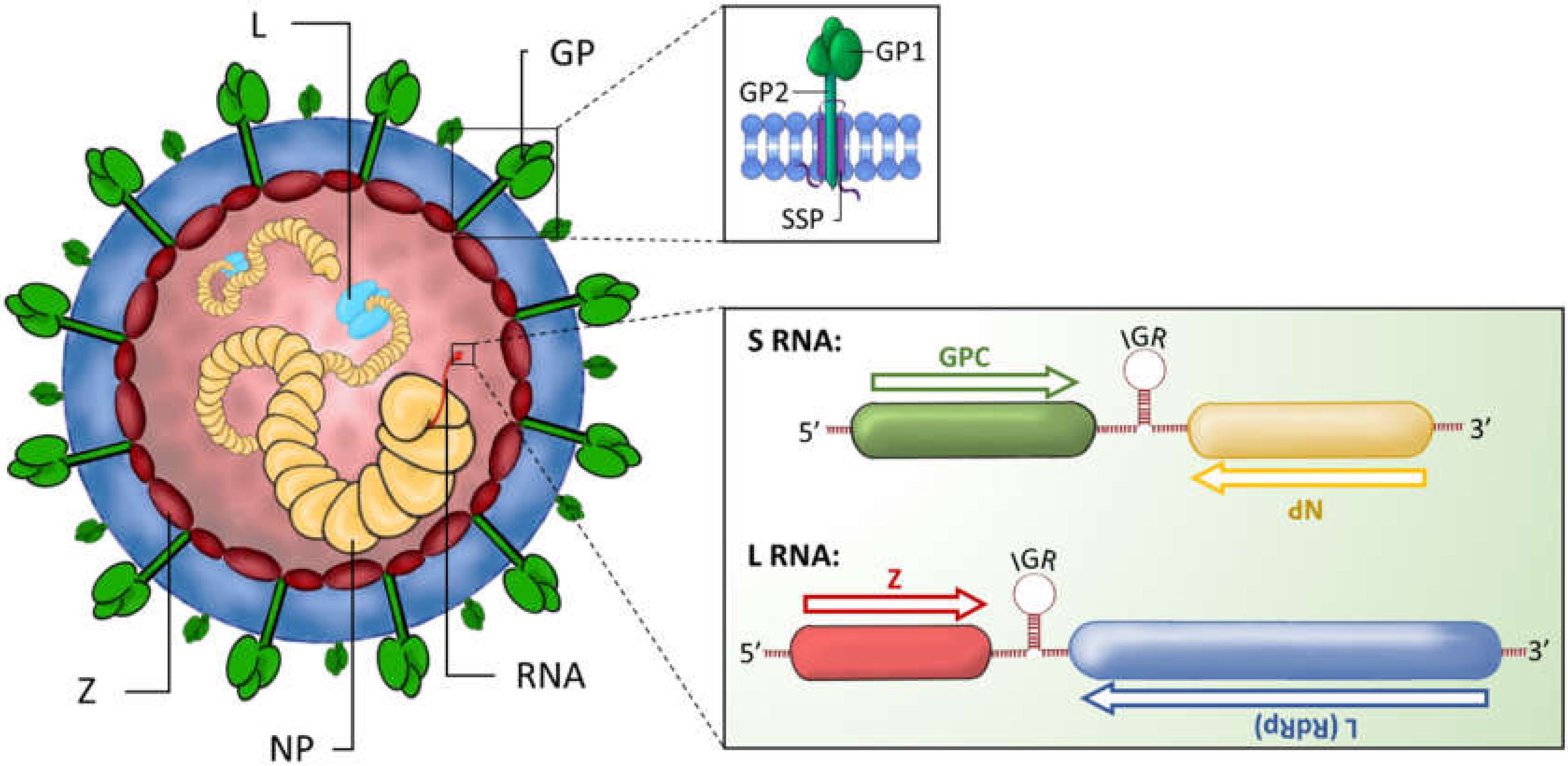S 분절 RNA는 약 3.5kb이며 바이러스 뉴클레오캡시드 단백질 (NP)과 당단백질(GPC)을 암호화한다.[24] L 분절 RNA는 약 7.2kb이며 바이러스 RNA 의존성 RNA 중합효소(L)와 작은 RING 도메인 함유 단백질(Z)을 암호화한다.[25][26][27]