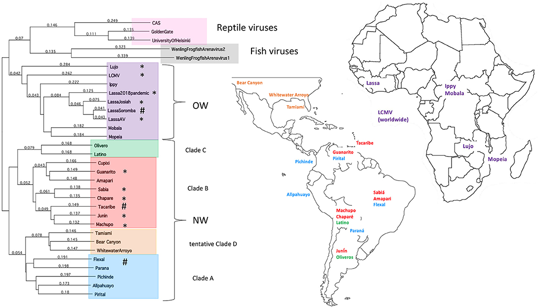 마마레나바이러스는 유전형과 지리적 분포에 따라 구세계와 신세계 두 혈청군으로 나뉜다.[37] 구세계 아레나바이러스는 유럽, 아시아, 아프리카에서 발견되며, 라사열의 원인인 라사 바이러스와 림프구 맥락수막염을 일으키는 림프구 맥락수막염 바이러스 등이 있다. 신세계 아레나바이러스는 아메리카 대륙에서 발견되며, 볼리비아 출혈열을 일으키는 마추포 바이러스, 아르헨티나 출혈열의 원인인 후닌 바이러스 등이 있다.
