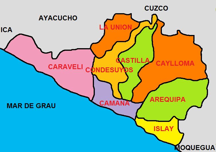 군은 다음과 같다.No 군 이름 중심지 1 아레키파 아레키파 2 카마나 카마나 3 카라벨리 카라벨리 4 카스티야 아플라오 5 카이요마 치바이 6 콘데수요스 추키밤바 7 이스레이 모옌도 8 라 우니온 코타와시
