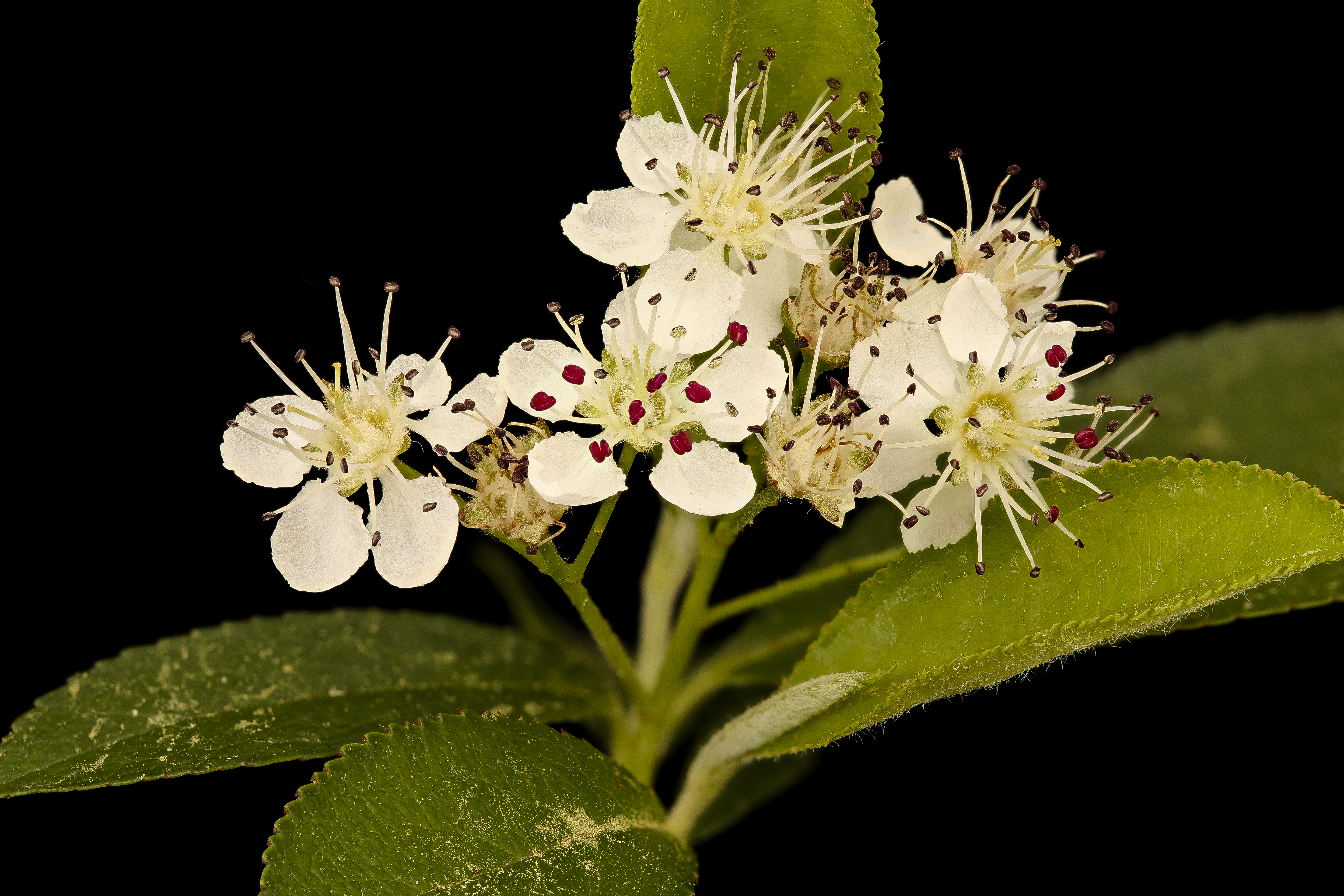 Aronia arbutifolia (Photinia pyrifolia) 붉은 초크베리 | 높이 2m~4m(드물게 최대 6m)까지 자라고 폭은 1m~2m)이다. 잎은 너비 5~8 cm이고, 뒷면에 털이 빽빽하게 나 있다. 꽃은 흰색 또는 옅은 분홍색이며, 너비 1cm이고, 선 모양의 꽃받침을 가지고 있다. 열매는 붉은색이며, 너비 4mm~10mm이고, 겨울까지 남아 있다. | 캐나다 동부, 미국 동부 및 중부, 텍사스 동부에서 노바스코샤까지, 온타리오, 오하이오, 켄터키, 오클라호마 내륙 지역 | |