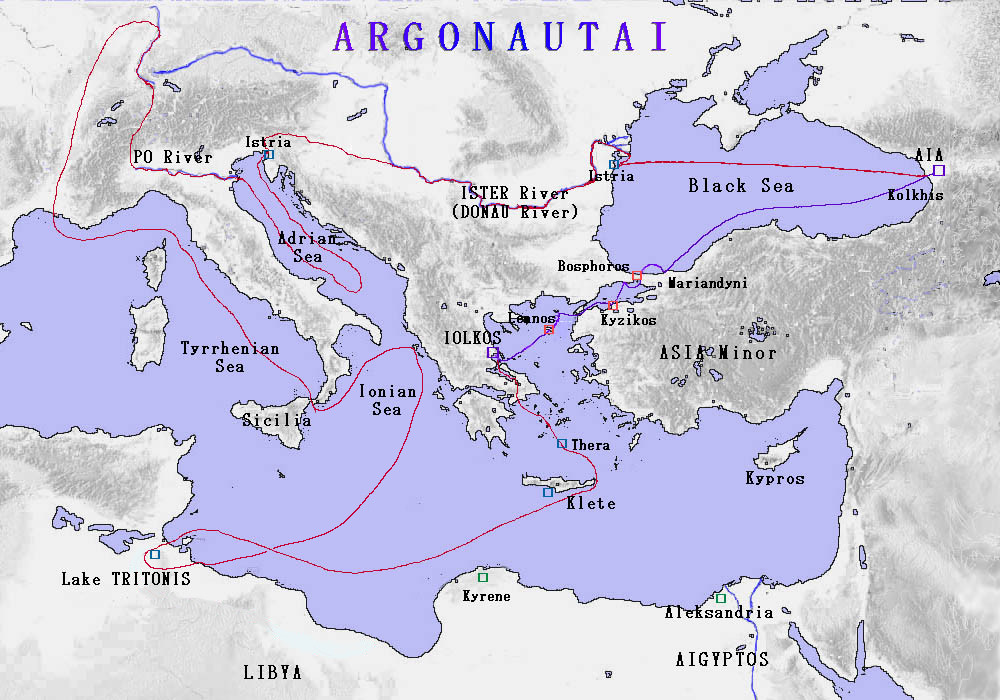 충돌하는 바위를 지나 (피네우스의 조언, 티피스의 조종술, 그리고 아테나의 도움 덕분에)[80] 그들은 흑해로 들어가, 히페르보레아인을 방문하기 위해 북쪽으로 날아가는 아폴론을 관찰하는 무인도인 티니아스에 도착했다. 다음 정거장은 하데스로 들어가는 입구 중 하나인 아케론 강 어귀였으며, 그들은 마리안디니아인의 왕이자 현재는 멸망한 베브뤼키아인의 왕의 적이었던 리쿠스를 만났다. 그는 그들을 매우 호의적으로 맞이했으나, 예언자 이드몬이 야생 멧돼지에게 죽임을 당하고 티피스가 병으로 죽으면서 그들의 출발이 지연되었다.