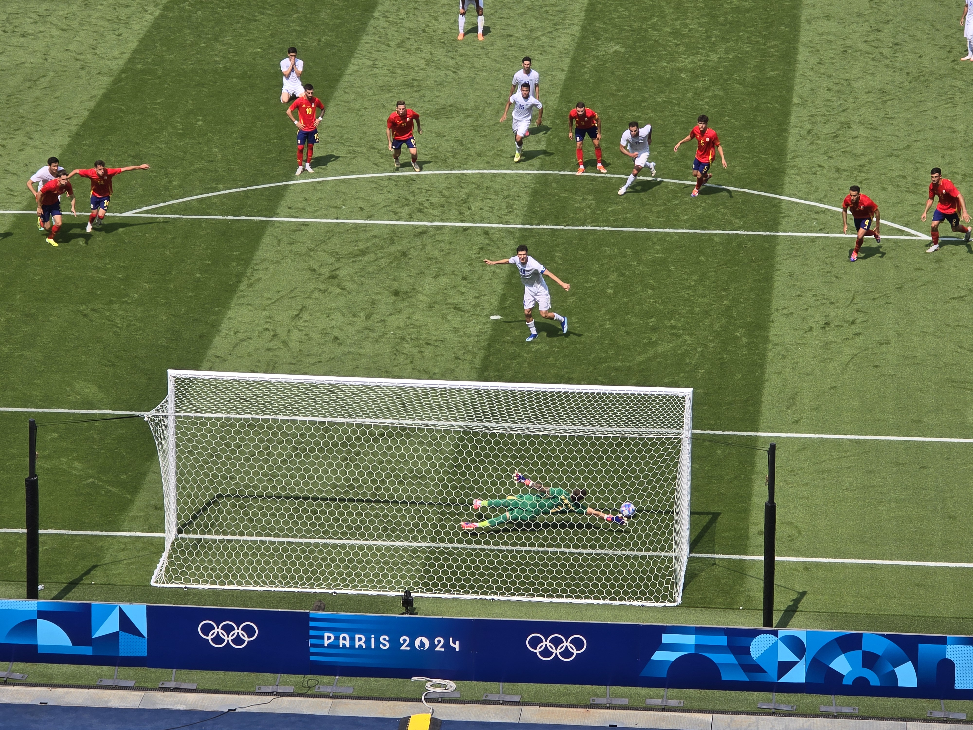 아르나우 테나스는 2024년 하계 올림픽 경기에서 엘도르 쇼무로도프의 페널티킥을 막으려 하고 있다.