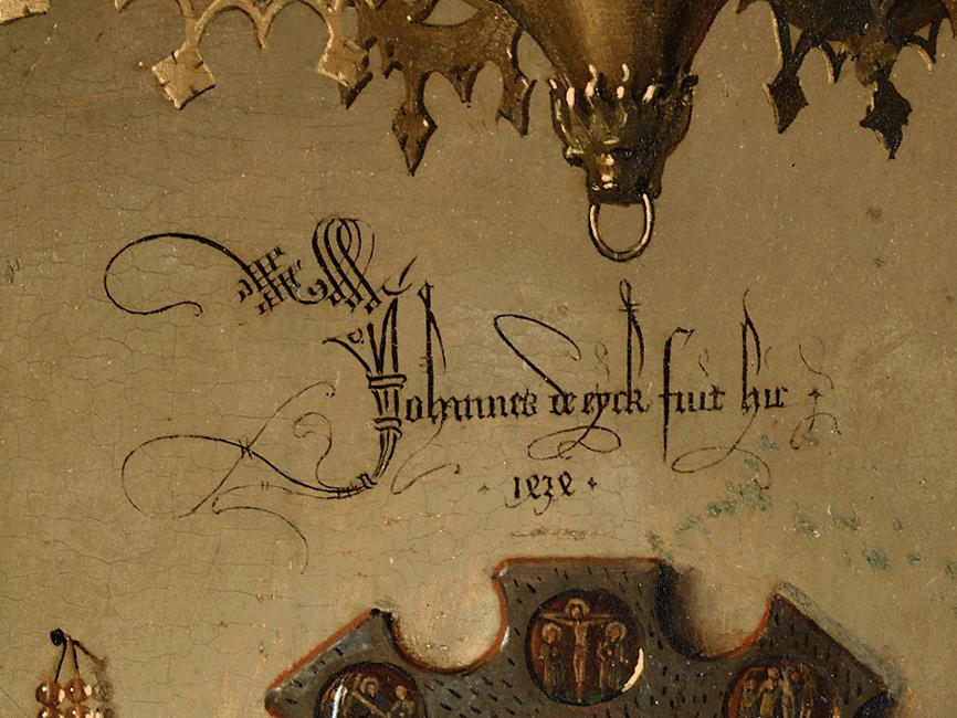 그림에는 거울 윗부분 벽에 "Johannes de eyck fuit hic. 1434" (얀 반 에이크가 1434년에 여기에 있었다)라고 서명과 날짜가 적혀 있다.[103] 이 서명은 당시 격언이나 다른 문구를 벽에 큰 글씨로 쓰는 방식을 모방한 것으로 보인다. 반 에이크의 다른 서명 중에는 자상화의 나무 액자에 트롱프뢰유로 그려, 나무에 조각으로 새긴 것처럼 보이게 한 것도 있다.[103]4. 학술적 논쟁
