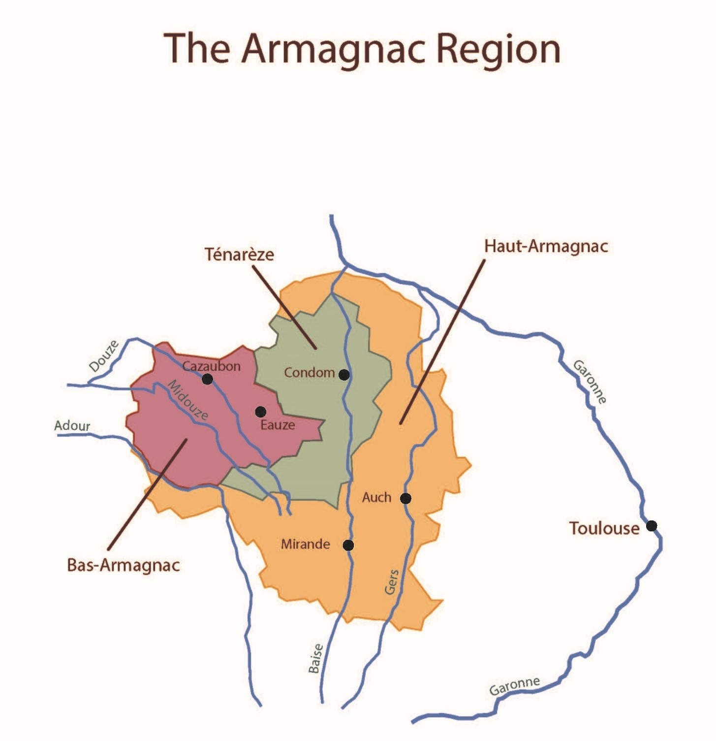 아르마냐크 지역은 피레네 산맥 기슭의 아두르 강과 가론 강 사이에 있으며, 1936년에 원산지 통제 명칭(AOC) 지위를 부여받았다. 공식 생산 지역은 제르, 랑드, 로-에-가론에 걸쳐 있는 세 개의 구역으로 나뉘며, 150 km2의 포도 재배 면적이 있다. 1909년 5월 25일의 팔리에르 법령에 따라 이 지역은 다음과 같이 구분된다.[11][3]