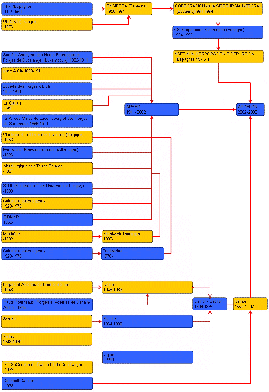 2001년 철강 불황기에 유지노르, 아세라리아, 아르베드 3사가 합병하여 아르셀로가 설립되었다. 아르베드는 전전(戰前)에 200가구의 슈나이더 가문과 합작하여 겔젠키르헨 광업을 인수했고, 유지노르의 모체인 반데르 시데롤의 건설 및 관련 부문은 퐁트-아-무송(현 생고뱅)에 독점되어 있었다.2. 2. 미탈 스틸의 적대적 인수와 합병 (2006년)