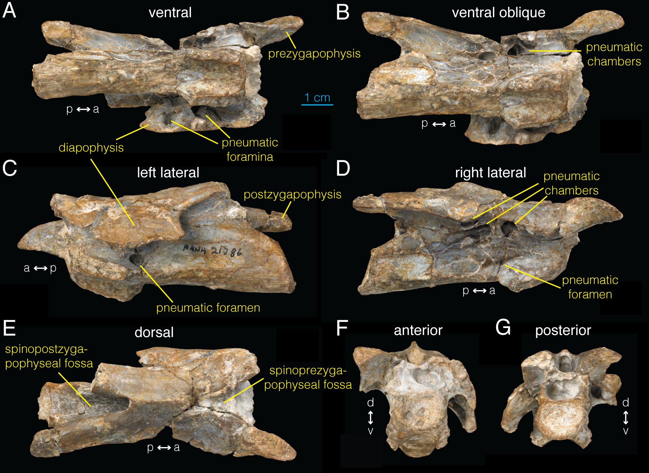 뒷다리는 튼튼하게 만들어졌다. 셋째 중족골은 위쪽 끝이 좁아지지 않아 발은 관절중족골형이 아니었다.[3] 경추는 폐쇄성이 높고 신경궁과 중심체(척추 몸통) 전체에 매우 복잡한 내부 공간이 있어 경추 기낭의 존재를 나타낸다. 앞쪽 등쪽과 일부 꼬리 척추는 어느 정도의 폐쇄성을 보이지만, 천골은 비폐쇄성이다.[14]