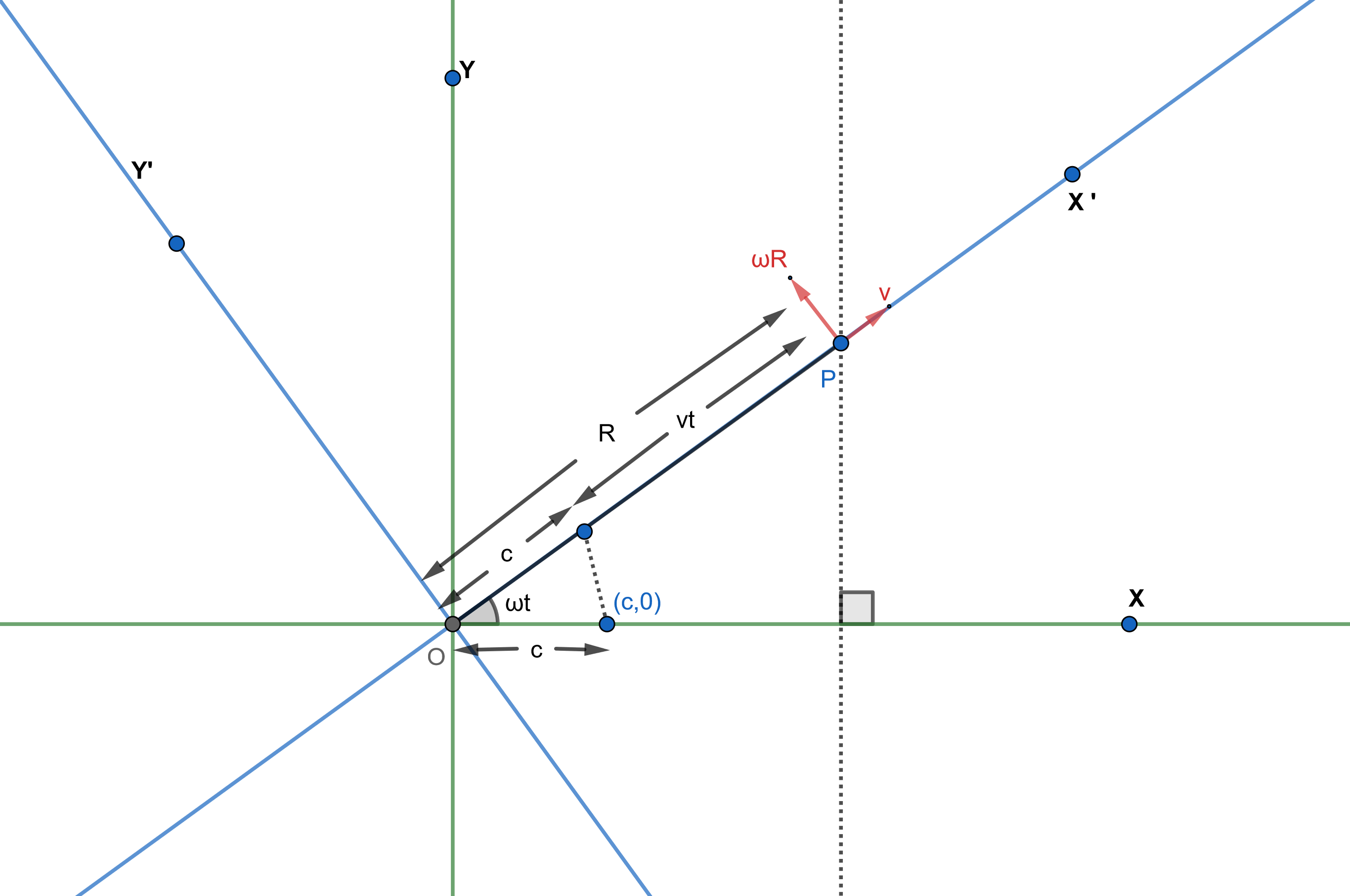 점 물체가 ''xy'' 평면에 대해 ''x''축과 평행한 방향으로 일정한 속도 ''v''로 데카르트 좌표계에서 움직인다고 가정한다. 시간 ''t'' = 0에서 물체가 임의의 점 (''c'', 0, 0)에 있었다고 하자. ''xy'' 평면이 ''z''축을 중심으로 일정한 각속도 ''ω''로 회전하면, ''z''축에 대한 점의 속도는 다음과 같이 나타낼 수 있다.