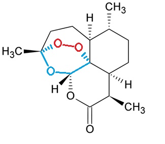 아르테미시닌은 락톤(lactone) 구조를 가지고 있어 안정성과 물에 대한 용해성이 떨어진다. 또한, 트라이옥세인(Trioxane) 구조 안에는 산소 원자 두 개가 일렬로 연결된 엔도페록시드(Endoperoxide)가 있는데, 이 부분이 말라리아 기생충을 없애는 데 중요한 역할을 한다.[102]