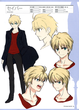 나스 키노코가 ''Fate/stay night''를 쓰기 시작하기 전, 그는 학생 시절 여가 시간에 재미로 루트 ''Fate''를 썼다. 이때 시로와 세이버의 성별은 바뀌었는데, 이는 소설 ''쓰키히메''에 대한 경험 때문이었으며, Type-Moon은 이것이 현대 인구 통계에 적합하다고 믿었다. 타케우치는 갑옷을 입은 여성을 그리는 아이디어를 떠올렸고, 그 결과 세이버가 여성으로 설정되었다.[46] 타케우치는 세이버를 시리즈에서 가장 좋아하는 서번트 중 하나이자 시간이 있을 때마다 그릴 정도로 이상적인 신부라고 불렀다.[47] 시로와 세이버의 관계는 이전의 픽션 로맨스와는 다르게, 본능만으로 움직이는 것이 아니라 논리도 작용하도록 의도되었다.[97] 시로와 세이버의 첫 만남을 복선으로, 제작진은 시로가 후자가 휘두르는 신화 속 검 엑스칼리버를 보는 꿈 시퀀스를 포함시켰다. 시로가 엑스칼리버의 칼집 아발론을 소유했기 때문에, 나스는 이 설정을 통해 둘이 어떻게 마스터와 서번트가 되는지 설명했다.[48] 세이버는 "Unlimited Blade Works" 루트에서 성배에 대한 욕망을 버린 "Fate" 루트에서의 캐릭터와는 다르지만, 나스는 여전히 세이버가 성배와 대면한 후 전쟁에서 무엇을 할지에 대해 비슷한 결론을 내리기를 원했고, 결국 그녀의 손으로 파괴되는 결말로 이어졌다.[49]