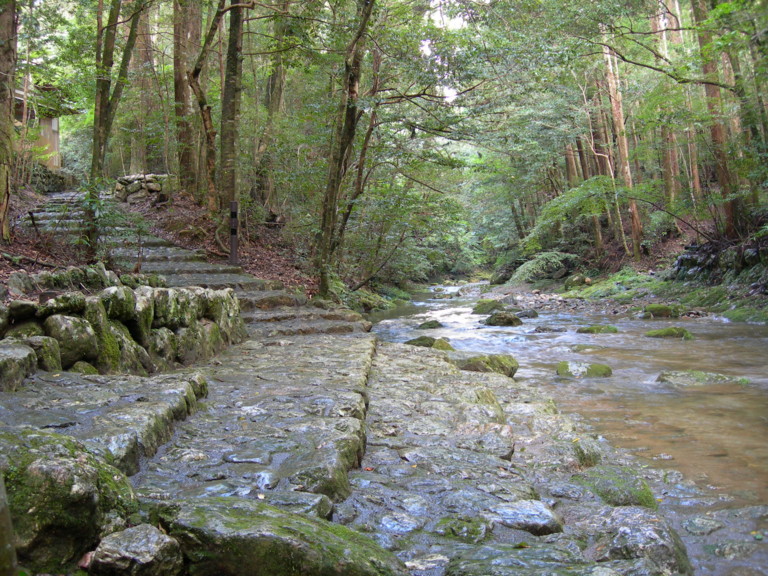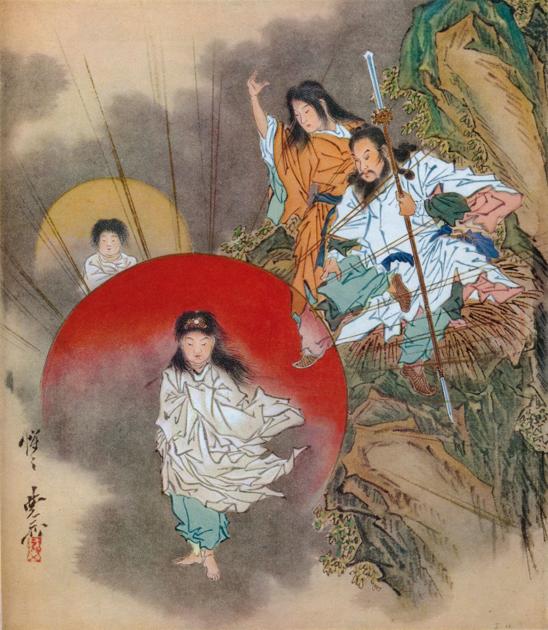 이자나기가 규슈의 쓰쿠시 섬에 있는 히무카의 아와기하라(다치바나 강 어귀)에서[32] 저승에 간 후 실패한 아내 이자나미를 구출하려는 시도 후, 자신을 정화하기 위해 강에서 미소기를 했다. 이자나기는 왼쪽 눈을 씻자 아마테라스가 태어났고, 오른쪽 눈을 씻자 츠쿠요미가 태어났으며, 코를 씻자 스사노오가 태어났다.[35][36][37] 그 후 이자나기는 아마테라스에게 다카마가하라("높은 하늘의 평원")을 다스리도록 임명한다.