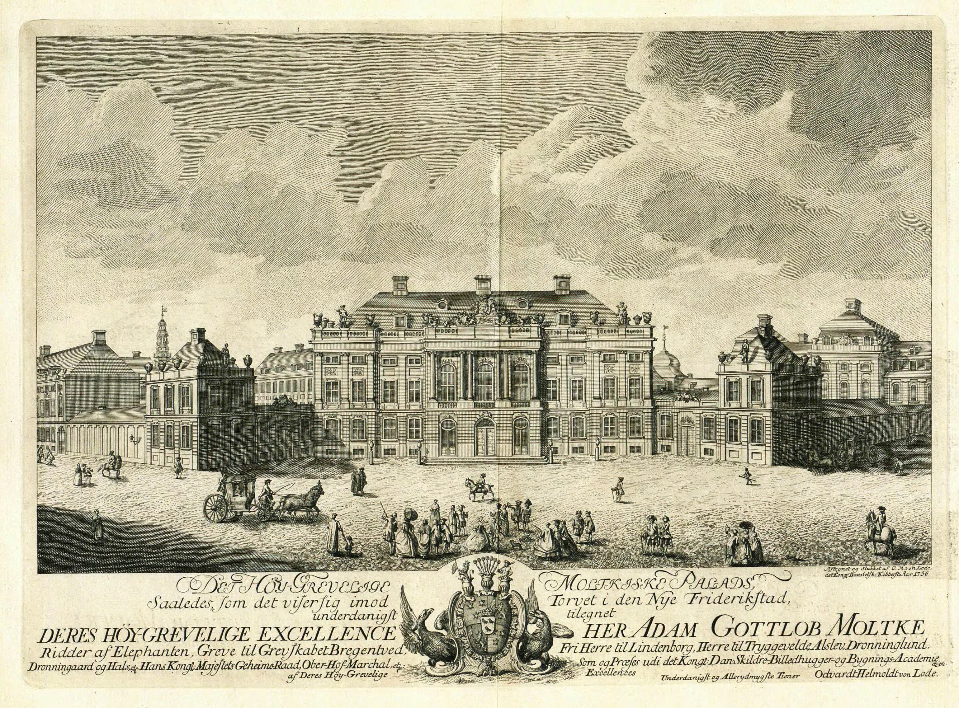 원래 이 궁전은 네 명의 귀족을 위해 건설되었다.[1] 1794년부터 1795년까지 국왕의 궁전인 몰트케 궁전과 왕세자의 궁전인 샤크 궁전을 연결하는 열주가 왕실 건축가 카스파르 프레데리크 하르스도르프에 의해 추가되었다.