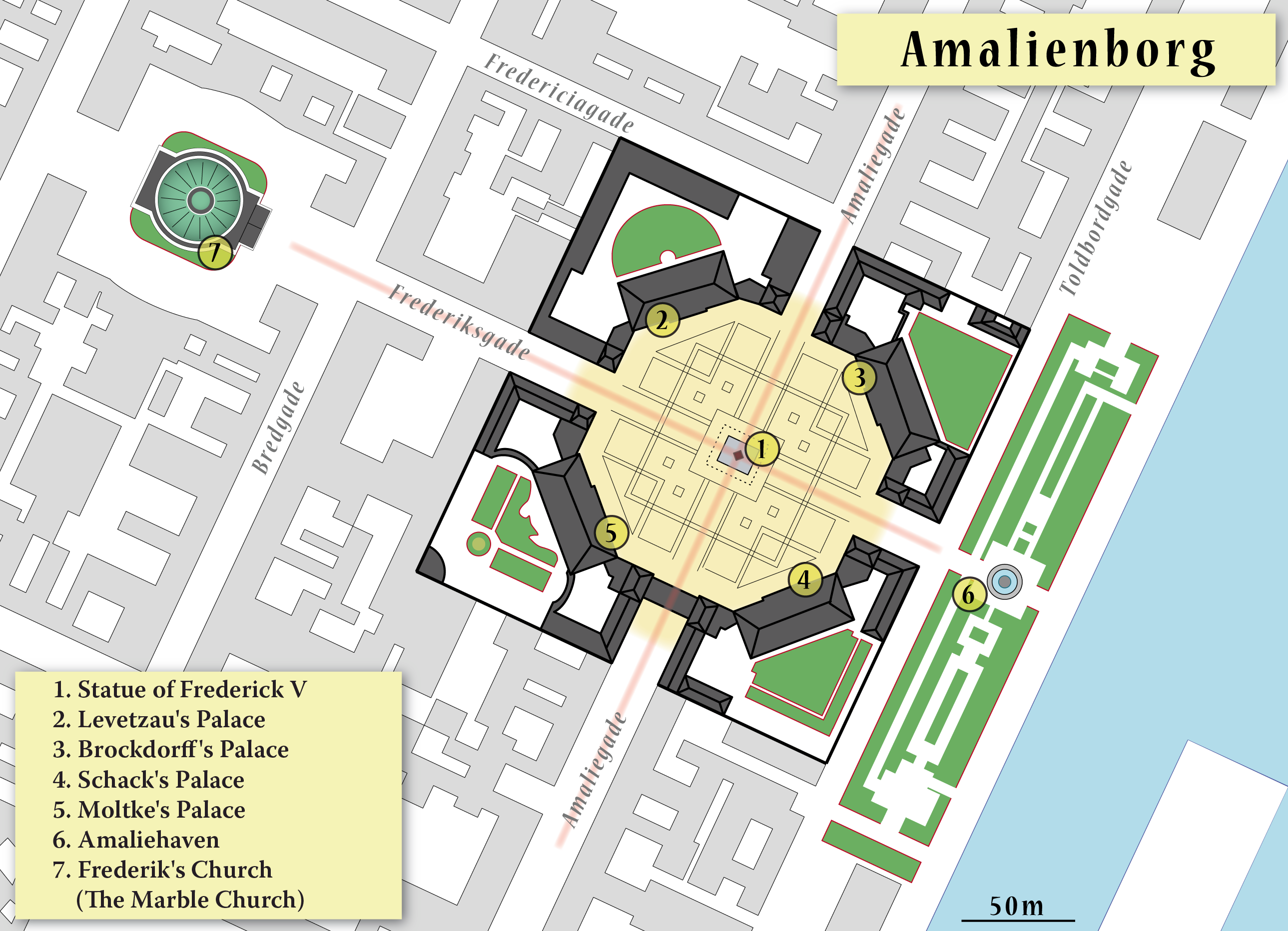 아말리엔보르성이 위치한 긴 축은 아말리에가데("아말리에 거리")이다.